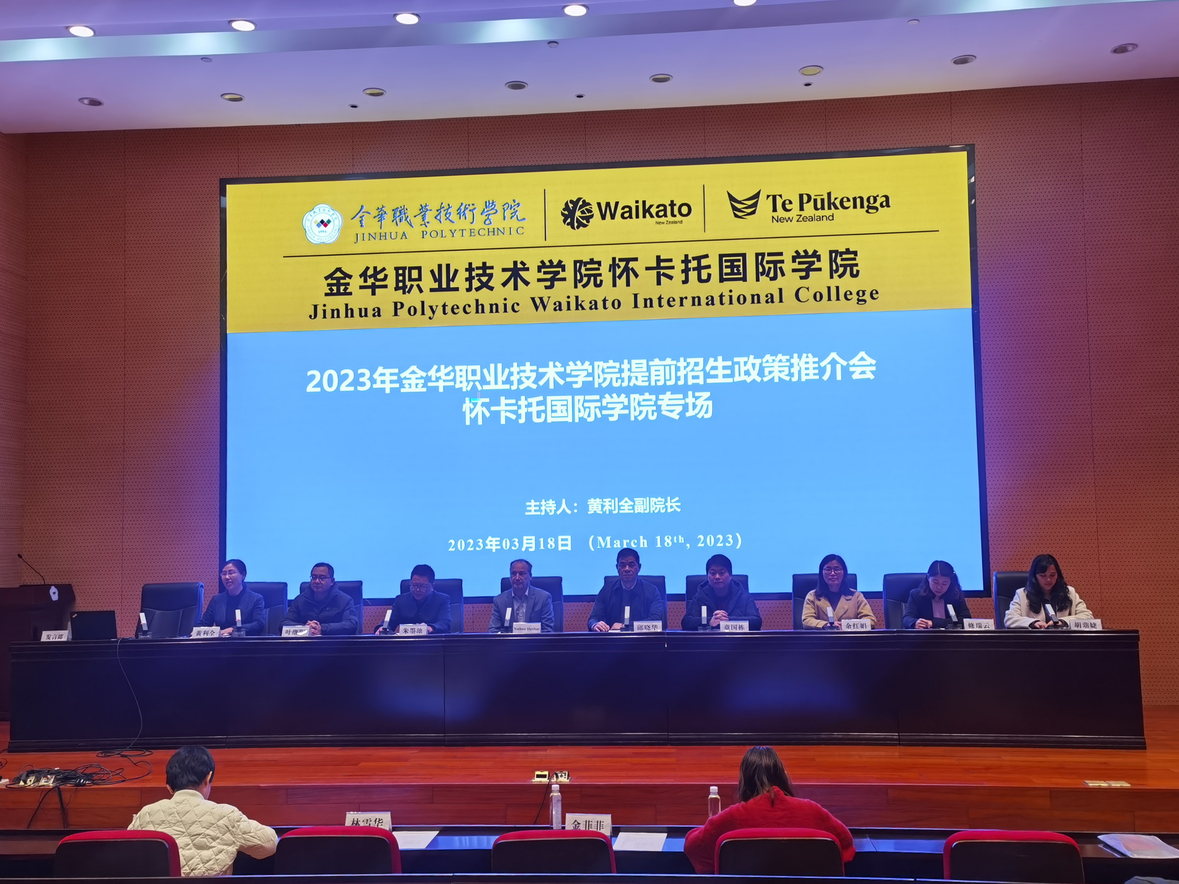 为让广大应届高三毕业生和家长更好地了解金职院提前招生政策和专业特色,3月18日晚7点,2023年金华职业技术学院高职提前招生政策推介会如期直播。本次推介会由信息工程学院(怀卡托国际学院)承办,学校学生处招生办主任、怀卡托国际学院相关负责人、新方副院长、及各专业主任等参加了此次推介会。