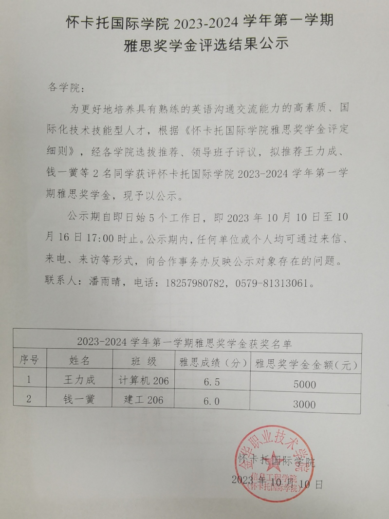 怀卡托国际学院 2023-2024 学年第一学期雅思奖学金评选结果公示