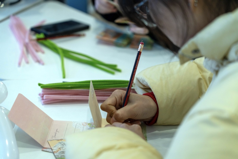 在互动环节中,同学们亲手制作了扭扭棒花束,并制作了英文卡片,用英文写下了对赠予对象的祝福和对未来一年后自己的期许。